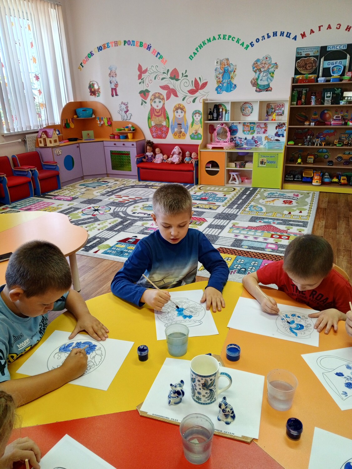 На занятии по рисованию дети подготовительной группы познакомились с русским промыслом росписи гжельский узор, изучили характерные бело-синие цвета, создали собственные узоры, используя различные техники рисования.