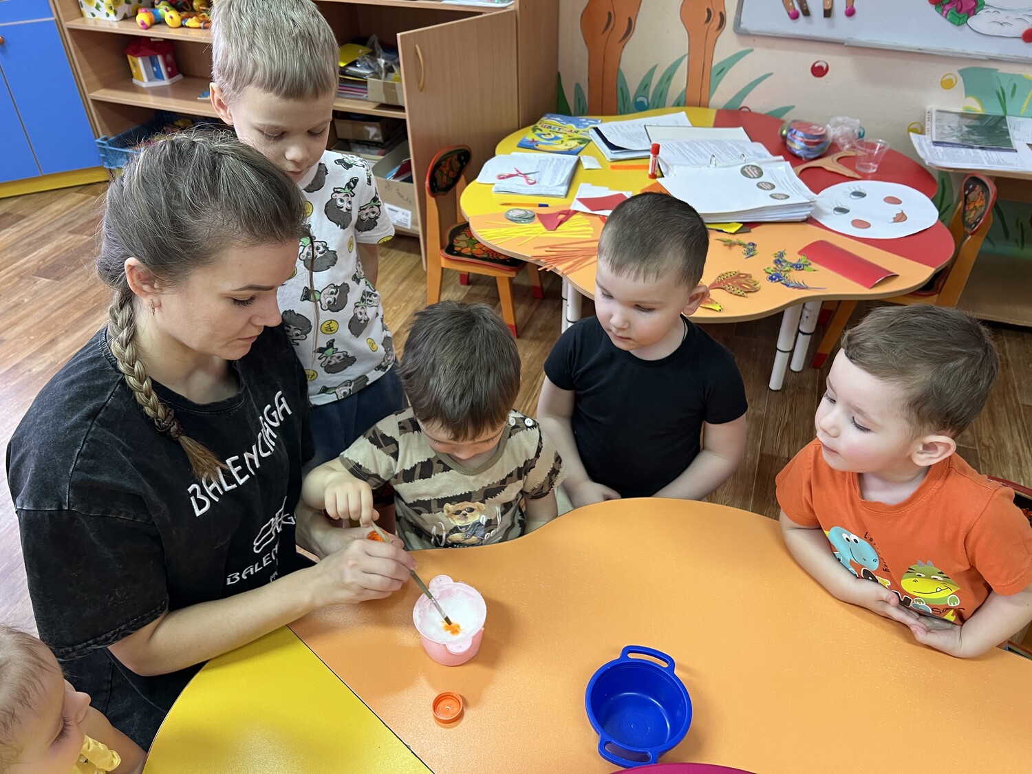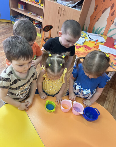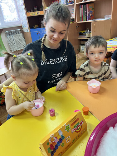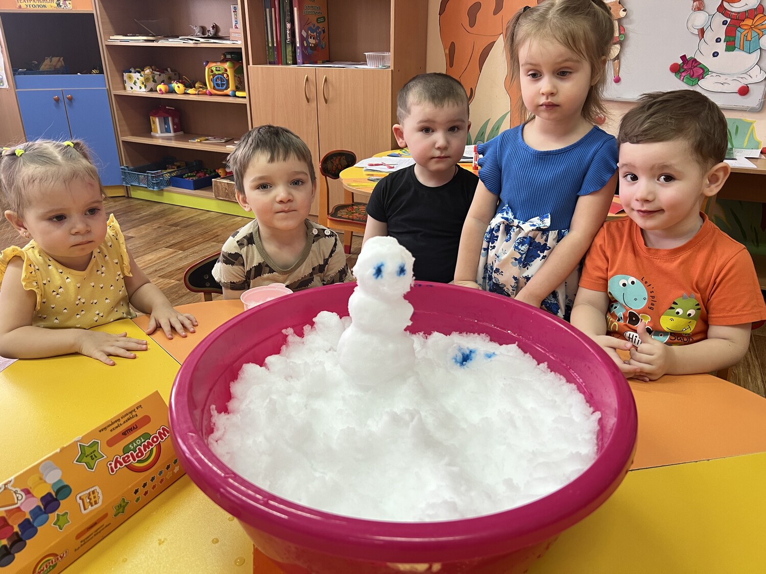 В первой младшей группе «Солнышко» прошло тематическое занятие на тему «Экспериментирование со снегом». Дети трогали снег, определяя что он холодный, белый и легкий. Из снега можно лепить снежки и снеговиков. Ещё ребята окрашивали снег и наблюдая, сделали вывод, что в теплом помещении снег тает и превращается в воду. Вот, сколько интересного узнали наши воспитанники.