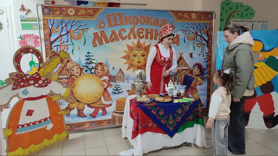 Утром— детей и родителей — встречала задорнпя народная музыка и Русская Красавица с блинами.Чтобы получить угощение, нужно было отгадать весёлую загадку про Масленицу, весну или блины. Такой прием по‑настоящему создавал праздничное настроение!