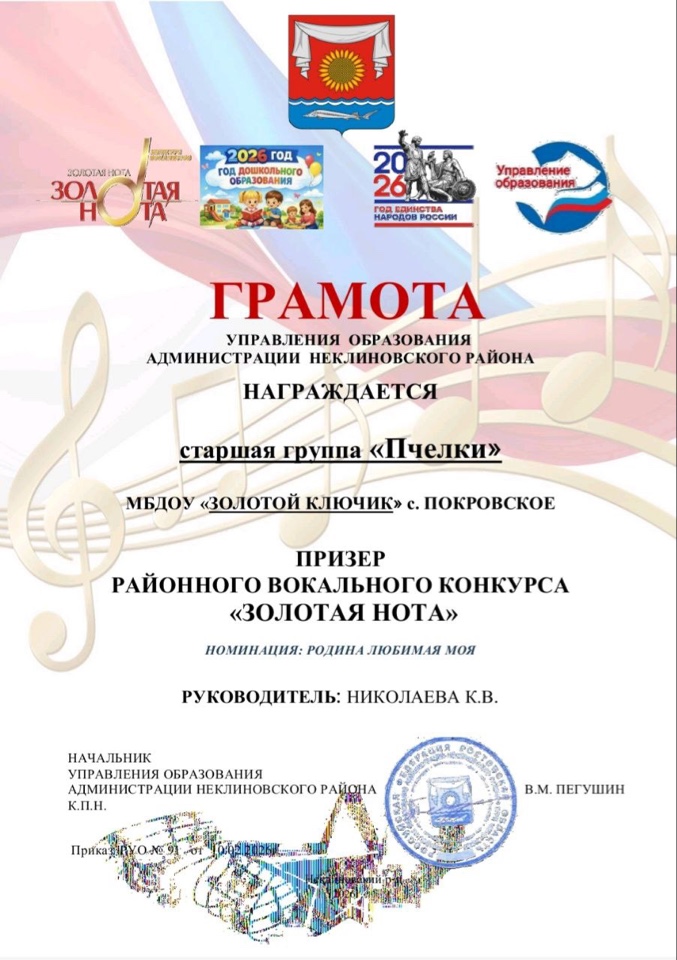 Рады поделиться отличной новостью: воспитанники старшей группы «Пчёлки» заняли третье место в районном вокальном конкурсе «Золотая нота» в номинации «Родина любимая моя»!