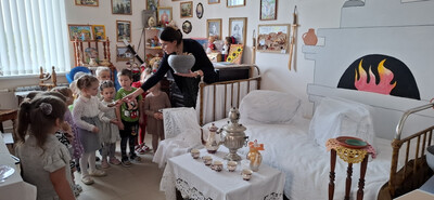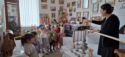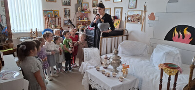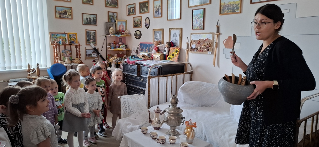 В ходе посещения мини-музея Донского казачества воспитатель Алёна Сергеевна Лесихина рассказала ребятам о том, как казаки варили кашу, что с помощью ухвата (также известного как рогач или вилка) доставали горячий чугунок из печи.